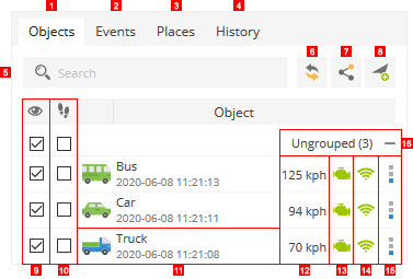 - Left panel - this panel provides access to: Object list, Events, Places (Markers, Routes, Zones) and History.